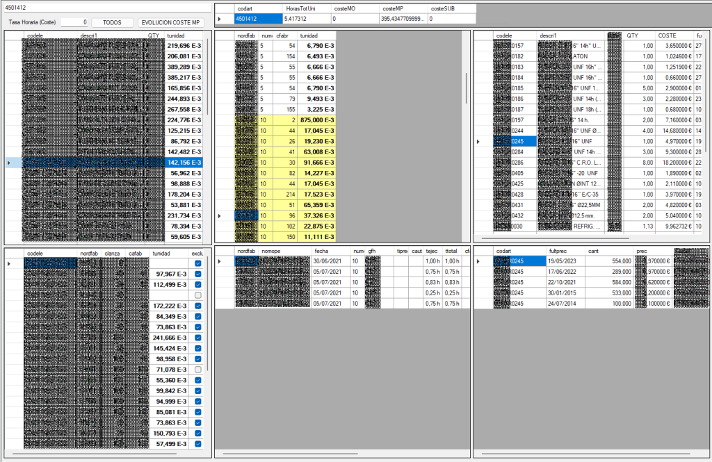 - En el mismo Panel se ven todas las Materias Primas que contienen los Artículos, aquellos que están el último Nivel y que, por tanto, son de Compra