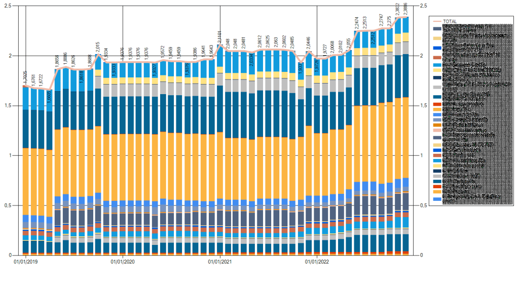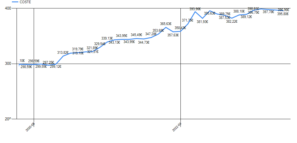 - Un gráfico de la evolución Total del coste por Materias Primas y Procesos.